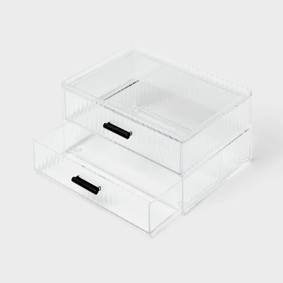 Whether you’re setting up a new vanity or want to add a space-saving storage solution to your bathroom, you’ll love the Clear Ribbed Acrylic Stacking Drawers from Threshold™. These stacking drawers includes two drawers with a ribbed design for a classic look you’ll love, and the clear design lets you easily see the contents. Made of acrylic, these ribbed drawers come complete with built-in handles for easy opening and closing.