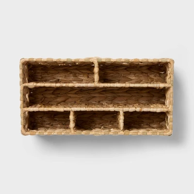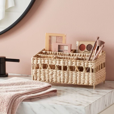 Accent any space in your home in an artistic way with the Natural Woven Makeup Organizer from Threshold™. This natural-shade organizer showcases a woven design to add a textured appeal to your vanity. Designed with a metal frame, this woven makeup organizer comes with multiple divided compartments to help keep makeup, brushes and other cosmetics separate and handy.